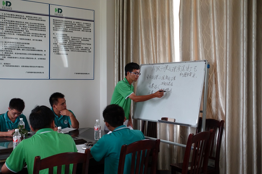 公司为增强技术力量。于8月8日在象州分公司举办第二期技术培训班,主要学习内容有《渗滤液处理工艺》、《MBR+膜法处理渗滤液工艺和操作要点》、《活性污泥法处理渗滤液工艺控制和水质化验知识》等。